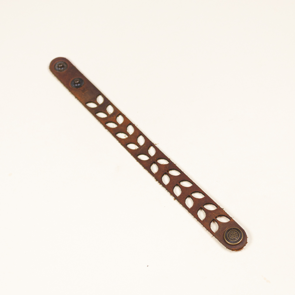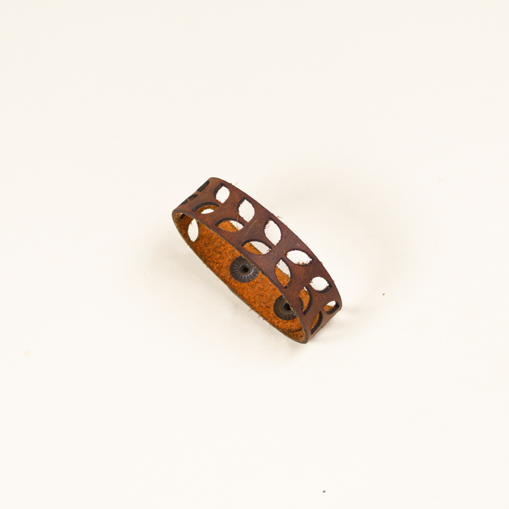 This striking leather bracelet is crafted from laser-cut full-grain leather, eco-tanned to ensure lasting color and flexibility. Inspired by nature motifs, its organic shape brings a bold yet lightweight statement to any outfit. Finished with a brass bottoms, it’s designed for both durability and elegance — ideal for sensitive skin and everyday wear. A unique accessory that blends nature, craftsmanship, and contemporary design.