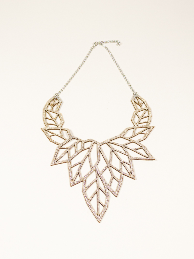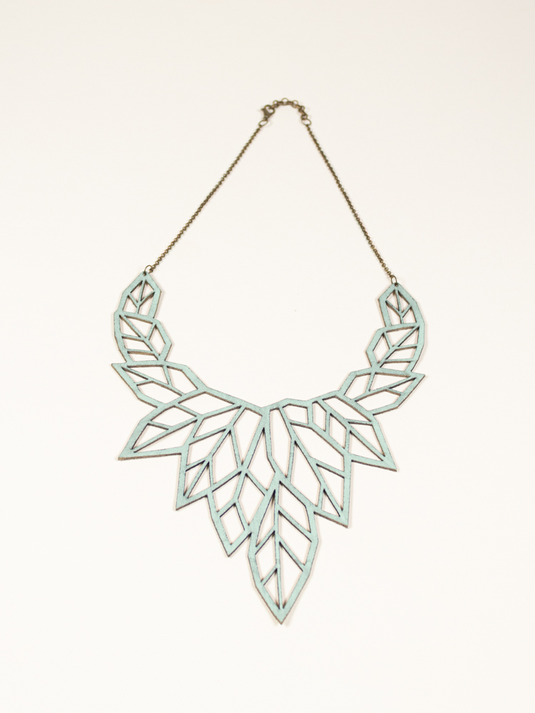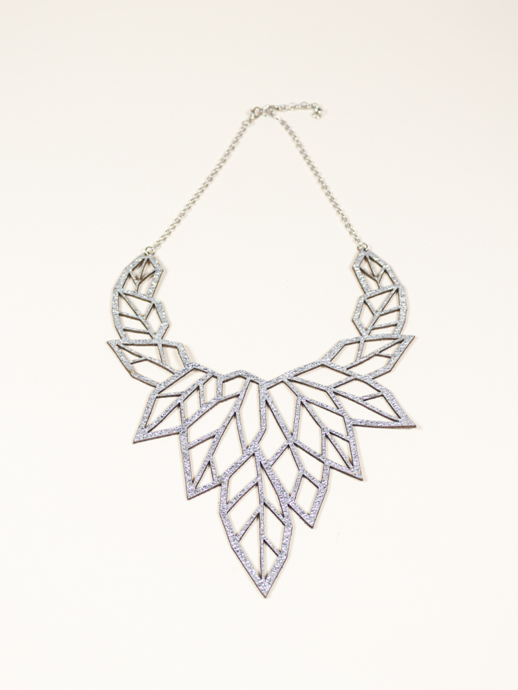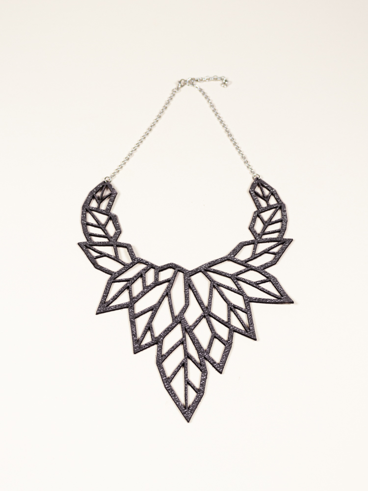 This striking bib necklace is crafted from laser-cut full-grain leather, eco-tanned to ensure lasting color and flexibility. Inspired by Geometric leaves shapes, its organic shape brings a bold yet lightweight statement to any outfit. Finished with a surgical-grade stainless steel chain and a secure carabiner clasp, it’s designed for both durability and elegance — ideal for sensitive skin and everyday wear. A unique accessory that blends nature, craftsmanship, and contemporary design.