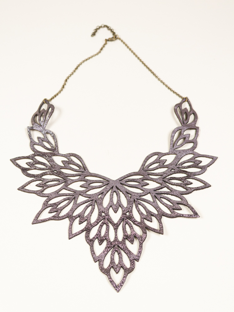 This striking bib necklace is crafted from laser-cut full-grain leather, eco-tanned to ensure lasting color and flexibility. Inspired by fractal mandala patterns, its organic shape brings a bold yet lightweight statement to any outfit. Finished with a surgical-grade stainless steel chain and a secure carabiner clasp, it’s designed for both durability and elegance — ideal for sensitive skin and everyday wear. A unique accessory that blends nature, craftsmanship, and contemporary design.