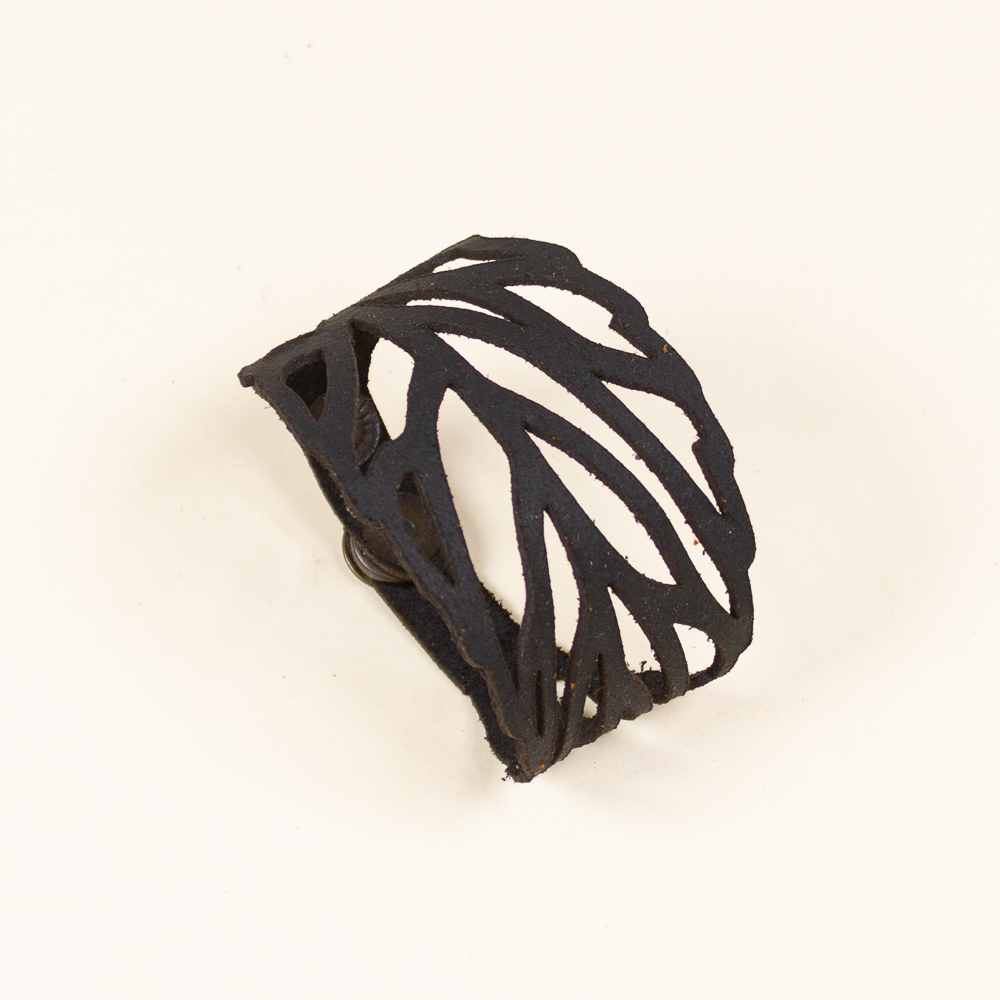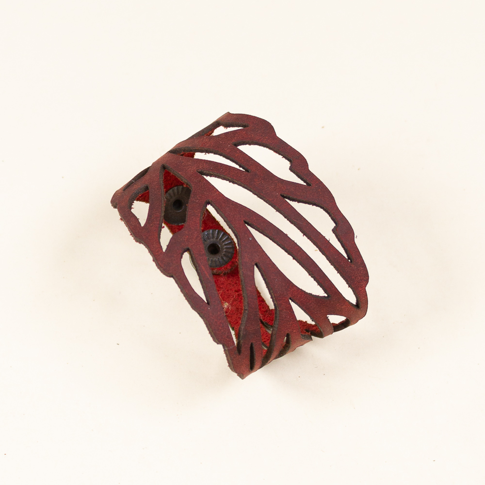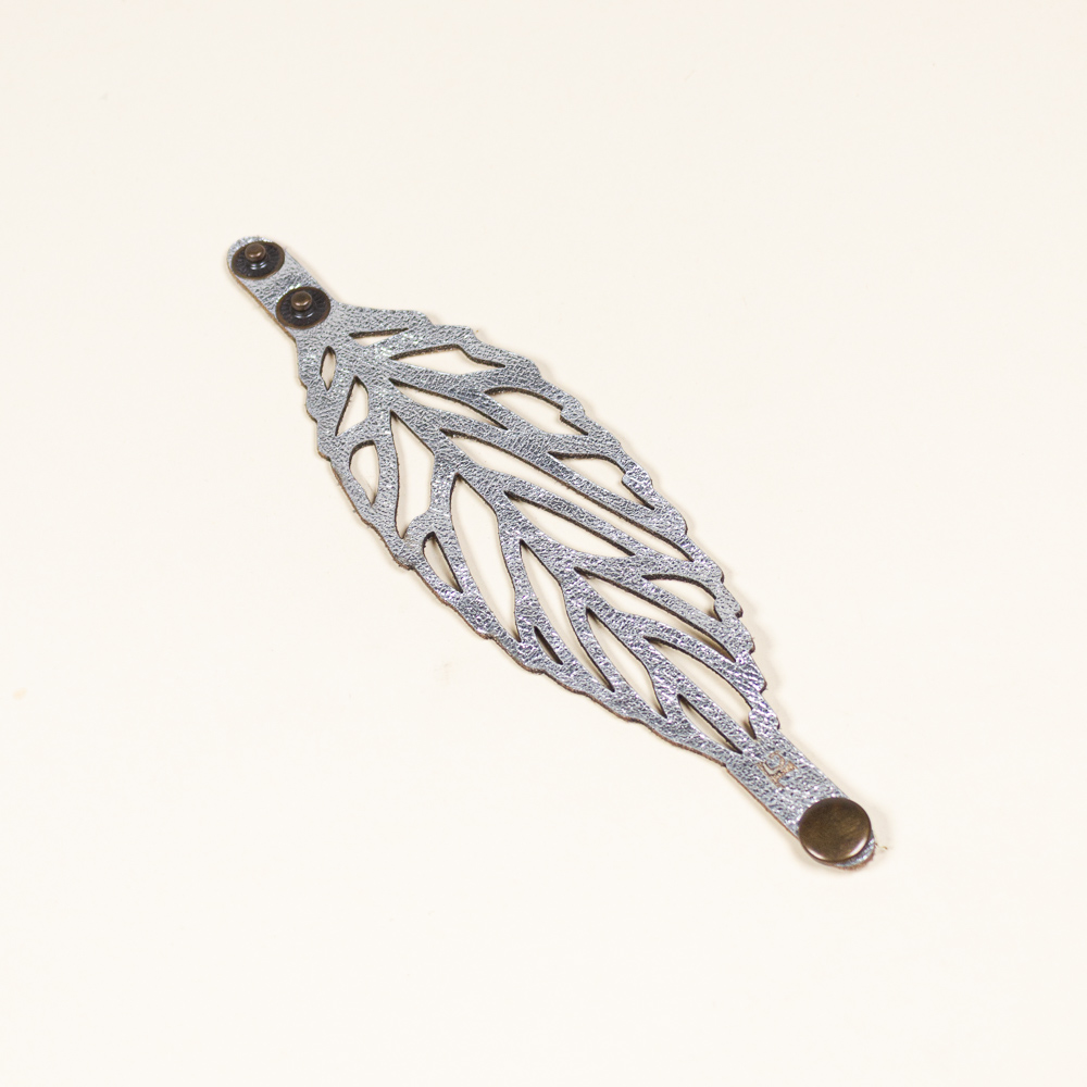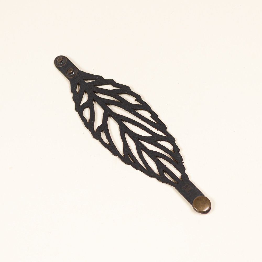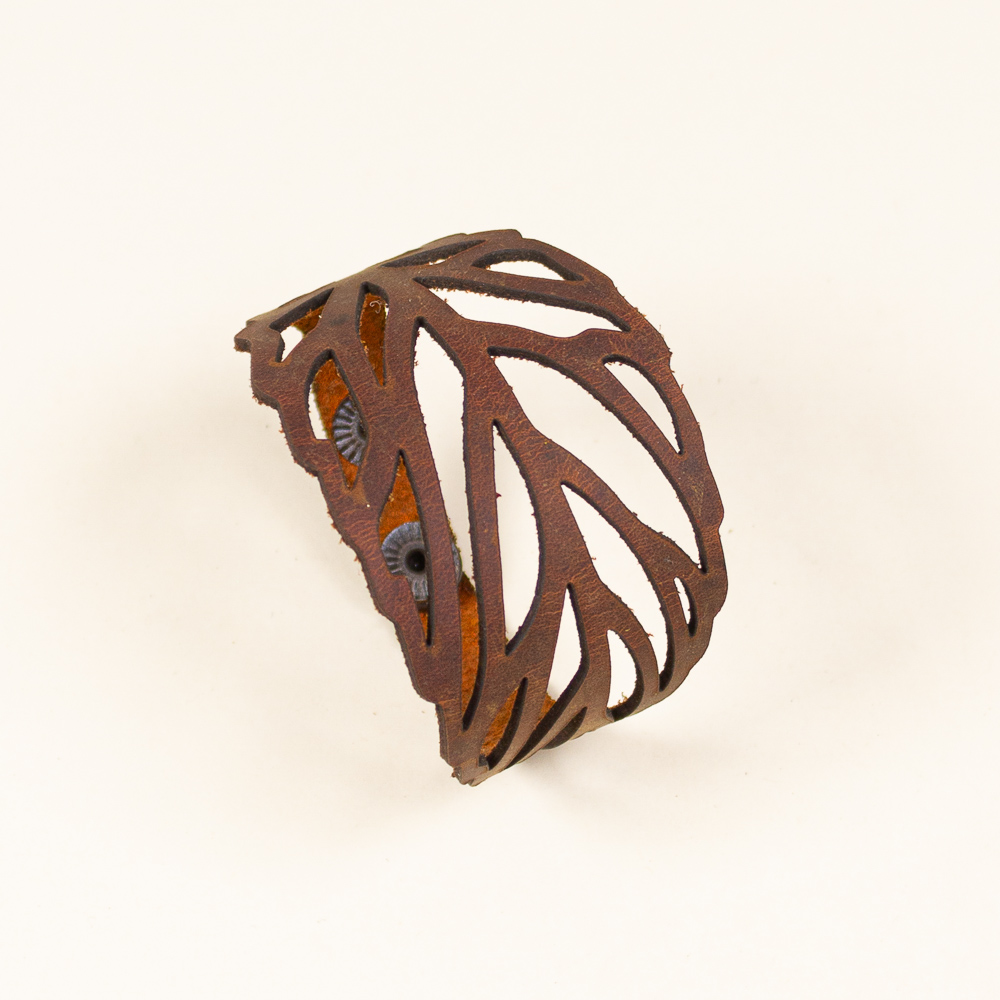 This striking leather bracelet is crafted from laser-cut full-grain leather, eco-tanned to ensure lasting color and flexibility. Inspired by nature motifs, its organic shape brings a bold yet lightweight statement to any outfit. Finished with a surgical-grade stainless steel chain and a secure carabiner clasp, it’s designed for both durability and elegance — ideal for sensitive skin and everyday wear. A unique accessory that blends nature, craftsmanship, and contemporary design.